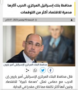 رئيس الأركان الصهيوني يصرح : "وقعت على أمر استئناف العمليات العسكرية في #غزة بعد انتهاء مهلة ايام الهدنة الاربعة " الناطق العسكري الصهيوني : "تم تمديد الهدنة إلى يومين آخرين من اجل إطلاق المزيد من الاسرى " واضح الضغوط على صانع القرار الصهيوني من اجل تمديد الهدنة هائلة ... ليس فقط بسبب الخسائر الفادحة قتلى وجرحى في صفوف الغزاة براً ... ولا ضغوط عوائل الاسرى بعد ان تأكدوا من النتن ياهو يتاجر بقضية اولادهم ...بل ما أعلنه محافظ البنك المركزي اليوم ان خسائر إسرائيل حتى الان تشكل 10 % من الناتج المحلي الإجمالي GDP ...اي مايعادل 52 مليار دولار !!! والقادم أسوأ . الكيان الصهيوني في مأزق حقيقي .