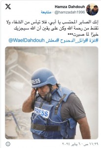 "إنك الصابر المحتسب يا أبي، فلا تيأس من الشفاء ولا تقنط من رحمة الله، وكن على يقين أن الله سيجزيك خيرًا لما صبرت". بهذه الكلمات المؤثرة التي وجهها -أمس السبت- الصحفي الشهيد حمزة لوالده صحفي الجزيرة وائل الدحدوح، عبر صفحاته على مواقع التواصل الاجتماعي، لم يكن يعلم أن المنشور الأخير له في هذه الدنيا سيكون لوالده. رحم الله الشهيد #حمزة وائل الدحدوح وألحقه في الصالحين ...ذهب إلى رحاب ربه باراً بوالده ، ملتحقاً بمن سبقه من أهله ، اللهم عوضهم دارا خيراً من دارهم ، واجعل مستقرهم في عليين ...يا الله . أمّا الصحفي #وائل_الدحدوح فقد اصبح ايقونة للتضحية والفداء ، ومدرسة للصبر ، نغبطه على ما أنعم الله عليه ً نتعلم منه ، ونفخر به ، نتواضع أمامه ....مهما عظم مصابنا . يا الله ...كيف يصقل الايمان الصادق معادن الرجال . إلا لعنة الله والملائكة والناس اجمعين على الصهاينة المجرمين . ...